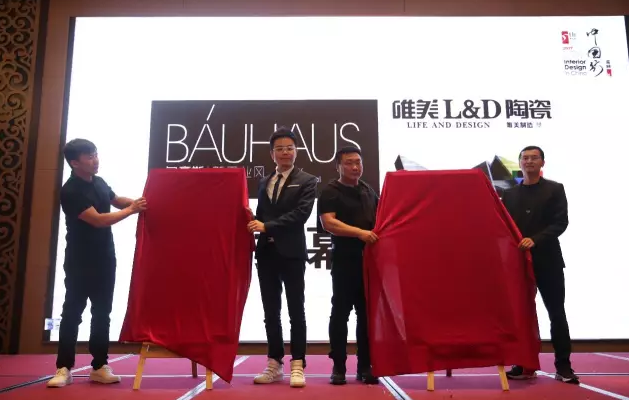 ▲福州宜美家建材有限公司余阿林先生(左一)、唯美L&D事業(yè)部市場總監(jiān)陸新華先生(右一)與兩位嘉賓共同為唯美L&D陶瓷“包豪斯·新工業(yè)風”新品揭幕